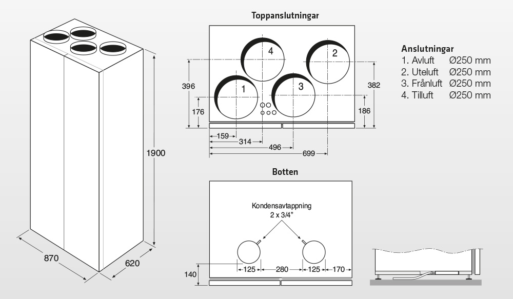 pulverlackade i vitt (RAL 9016) och dörrarna är försedda med magnetlist. Vår motströmsvärmeväxlare gör att värmeenergin i den förbrukade inomhusluften kan tas tillvara och användas för att värma den friska inkommande luften. Genom att använda en motströmsvärmeväxlare säkerställer vi också att luftläckage mellan förbrukad och frisk luft inte förekommer. Sammantaget ger detta en god driftsekonomi och en utmärkt komfort med bra inomhusklimat.