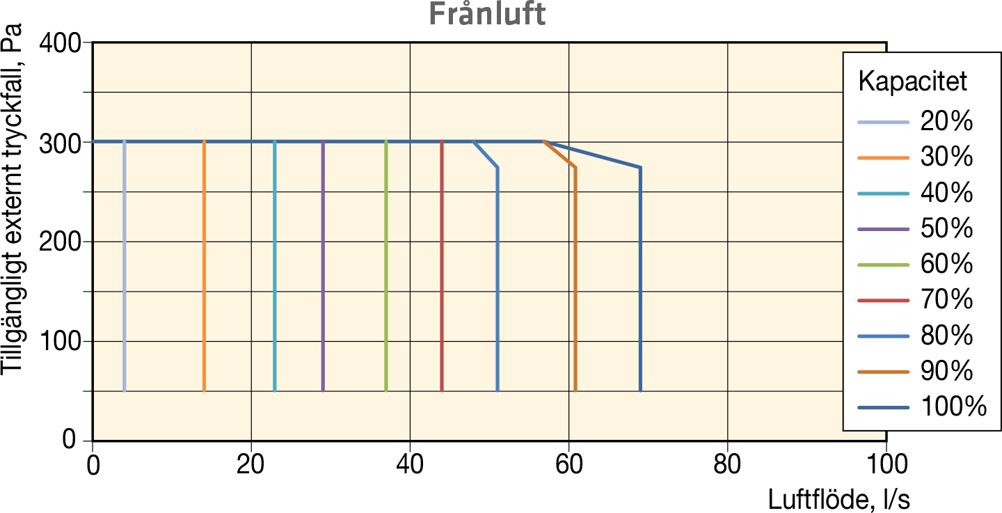 1,8 kW, vattenbatteri på upp till 1,6 kW eller förstärkt vattenbatteri på upp till 2,8 kW. Om ett vattenbatteri används, rekommenderar vi att ett automatiskt uteluftsspjäll monteras på uteluftskanalen för att